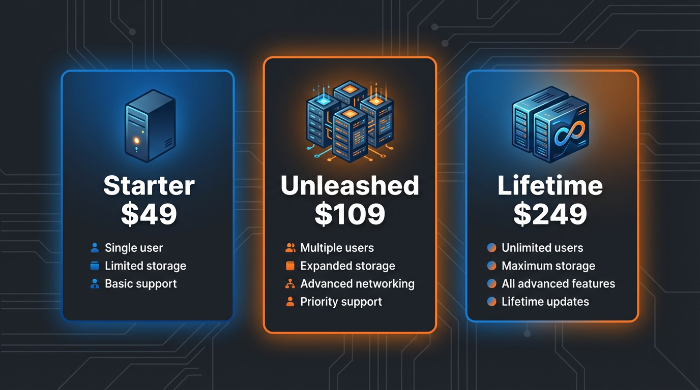 Nuestra recomendación: Empieza con la licencia Starter a $49. Es un precio de entrada increíblemente bajo para uno de los mejores sistemas operativos de servidor del mercado. Seis discos son más que suficientes para el 90% de los usuarios domésticos (por ejemplo, puedes tener dos discos de paridad de 14TB y cuatro discos de datos de 14TB, logrando más de 50TB de almacenamiento utilizable).